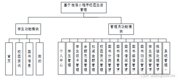 通过市场调研及咨询研究,了解了基于微信小程序校园生活管理及管理者的使用需求,于是制定了学生和管理员模块。功能结构图如下所示: