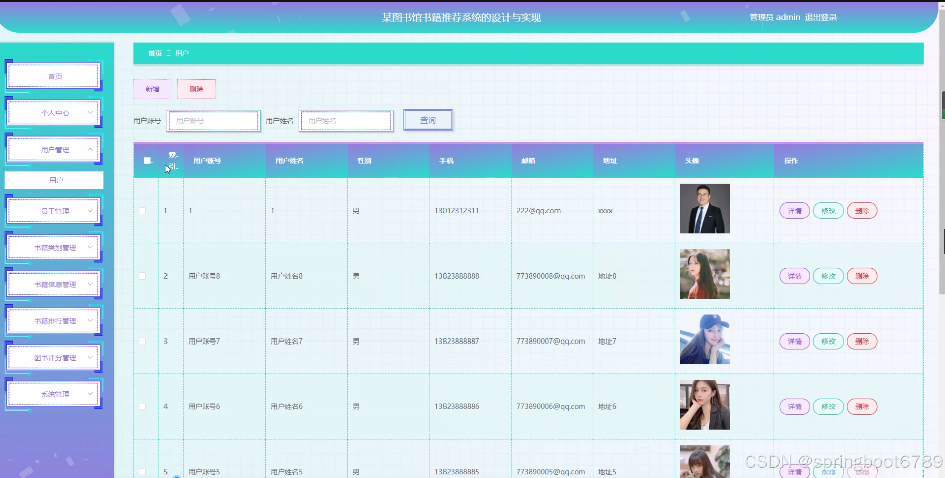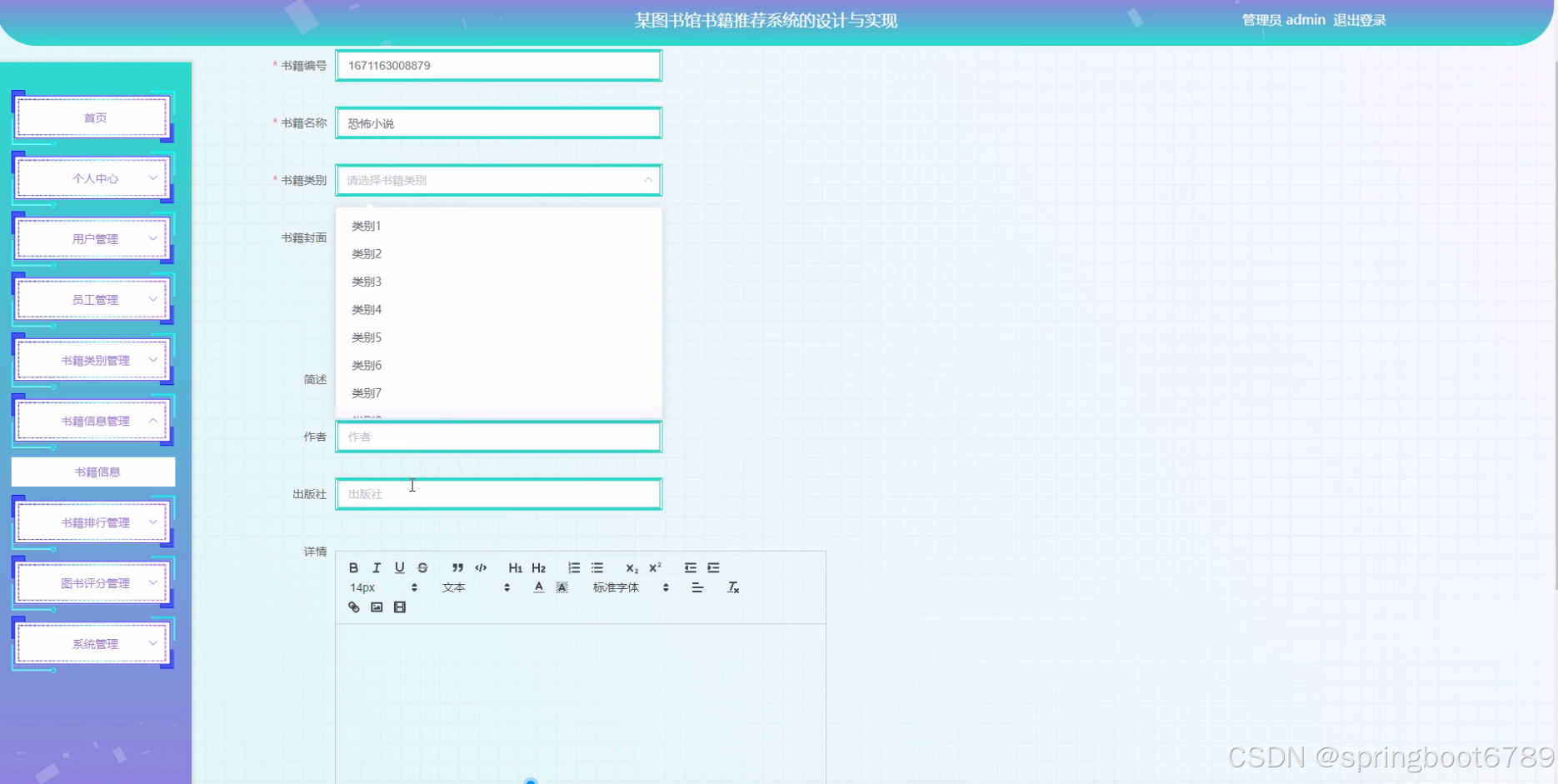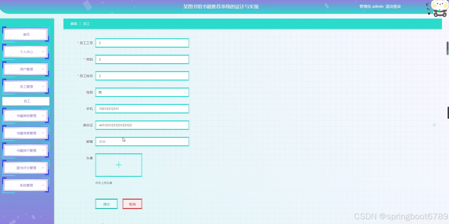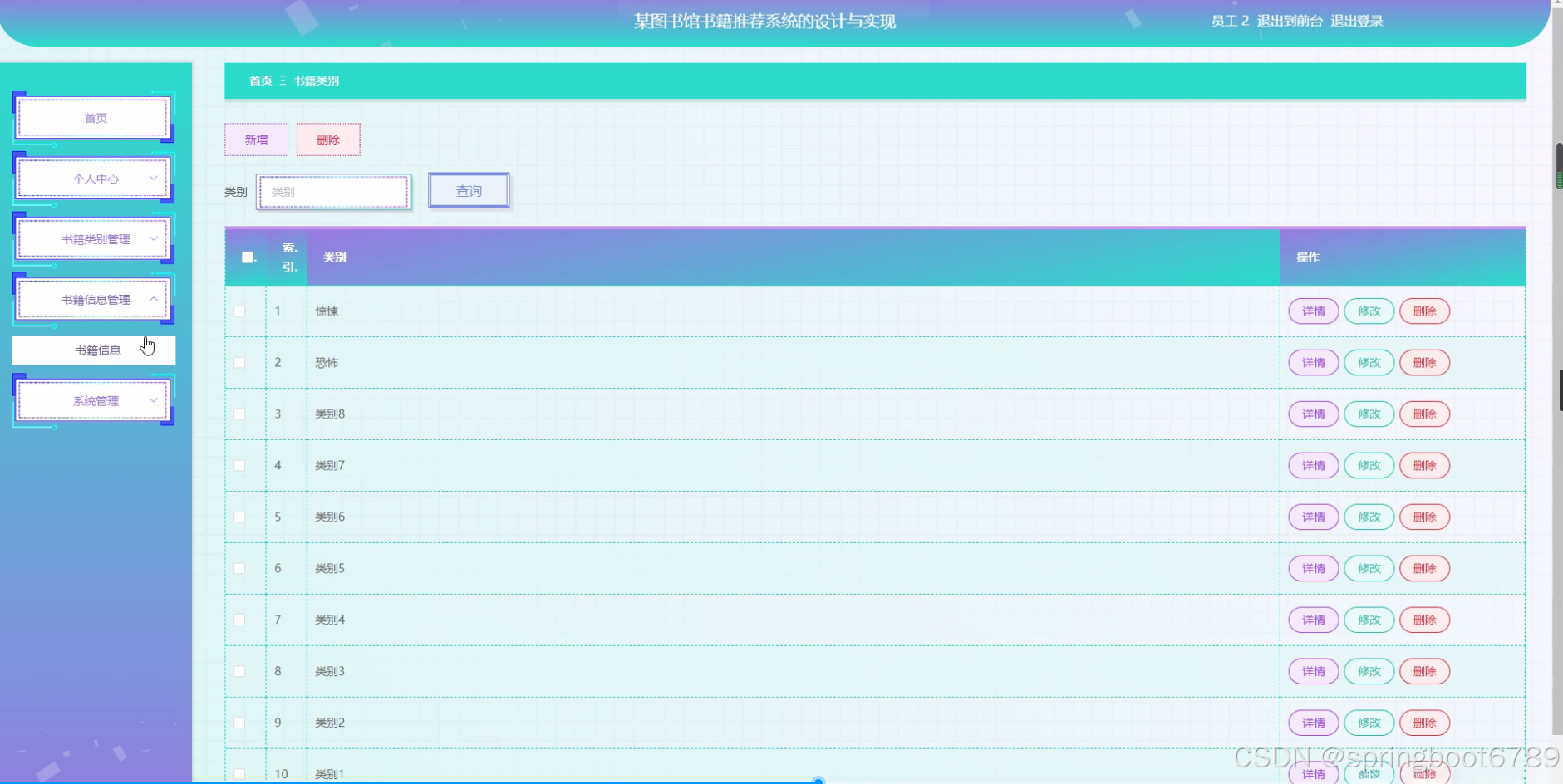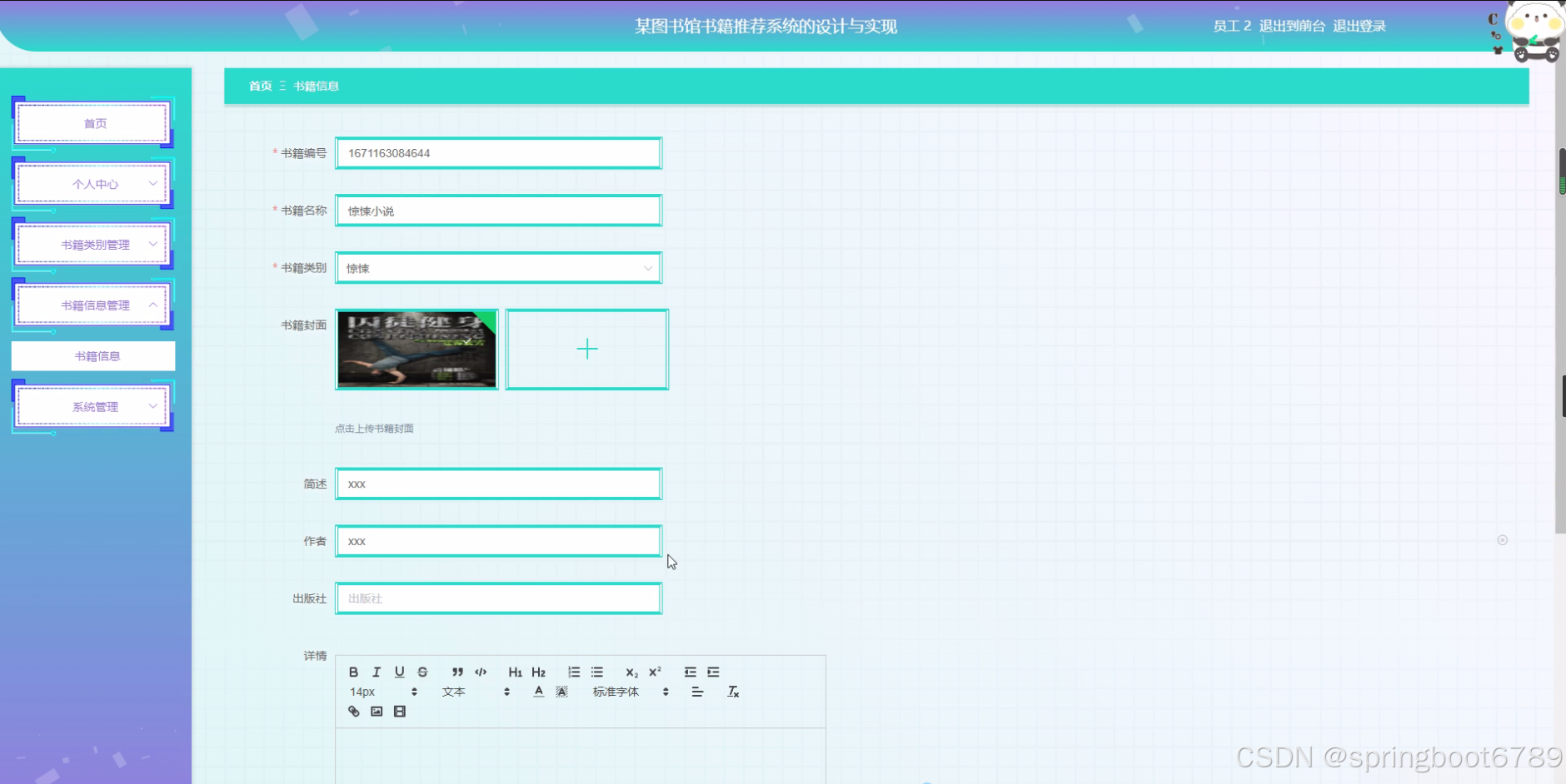 研究目的: 本研究的目的是设计和实现一个某图书馆书籍推荐系统,提供用户友好的界面和丰富的功能,以满足读者对个性化、精准的书籍推荐需求。通过用户、员工、书籍类别、书籍信息、图书评分、书籍排行、兴趣标签等功能的设计,实现对读者兴趣的分析和书籍推荐的全过程管理,包括读者兴趣建模、书籍匹配和推荐结果展示等环节。