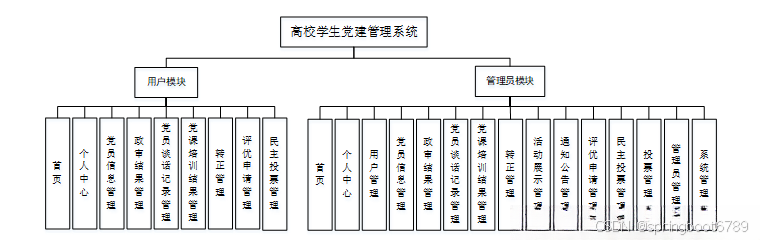 系统架构图属于系统设计阶段,系统架构图只是这个阶段一个产物,系统的总体架构决定了整个系统的模式,是系统的基础。高校学生党建管理系统的整体结构设计如图4-2所示。
