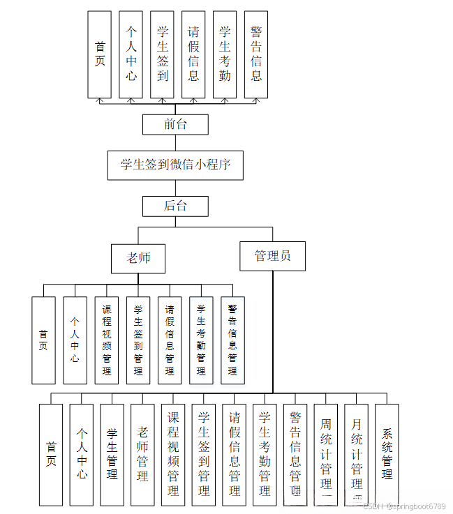 通过市场调研及咨询研究,了解了使用者及管理者的使用需求,于是制定了管理员,老师和学生等模块。其功能结构图如下图4-1所示:
