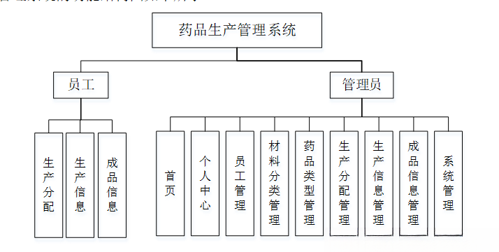 为了更好的去理清本系统整体思路,对该系统以结构图的形式表达出来,设计实现该药品生产管理系统的功能结构图如下所示: