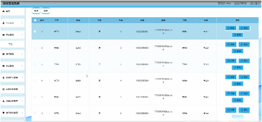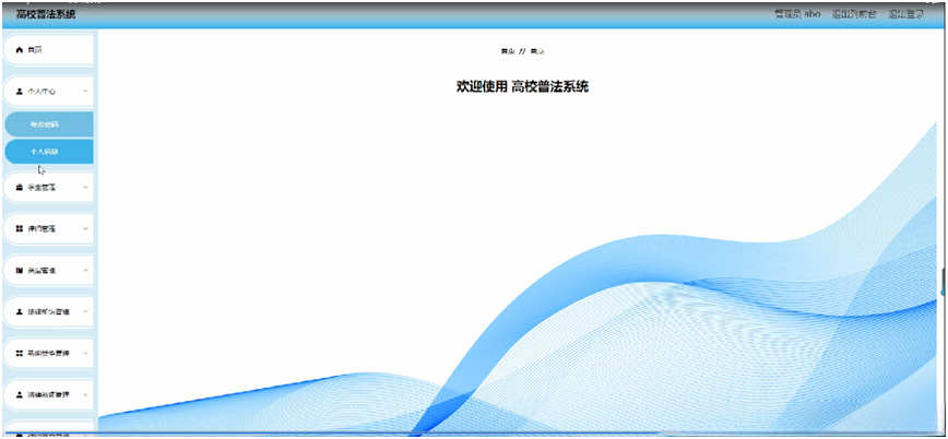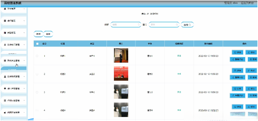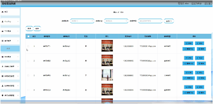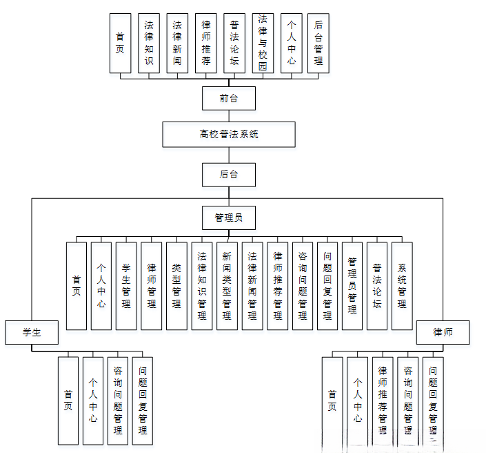 前台功能:学生进入系统可以实现首页,法律知识,法律新闻,律师推荐,普法论坛,法律与校园,个人中心,后台管理等进行操作。