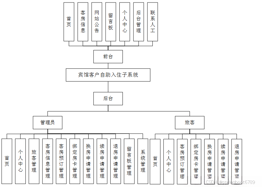 为了更好的去理清本系统整体思路,对该系统以结构图的形式表达出来,设计实现该宾馆客户自助入住子系统的功能结构图如下所示: