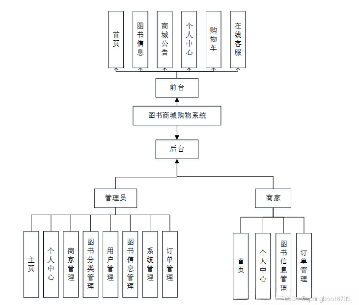系统设计是把本系统的各项功能需求进行细化,而转换为软件系统表示的一个设计过程,在对目标系统的研究分析之后,做出整个系统平台的总体规划,进而对用例中各个对象进一步地合理精细设计。为降低整个系统的复杂度,而使其更加便于修改,提高代码的可读性,我们会将系统模块化,模块间保持相对独立,且每个模块只完成一个子功能,并且与其他模块通过简单的接口链接,即高内聚低耦合原则,而使整个系统能够拥有一个高性能的结构,这边是系统概要设计最重要的目的。在之前的需求分析的基础上,本图书商城购物系统结构,如下图4-1所示。