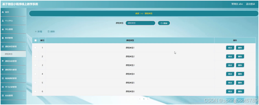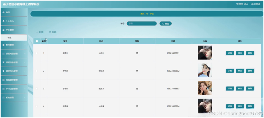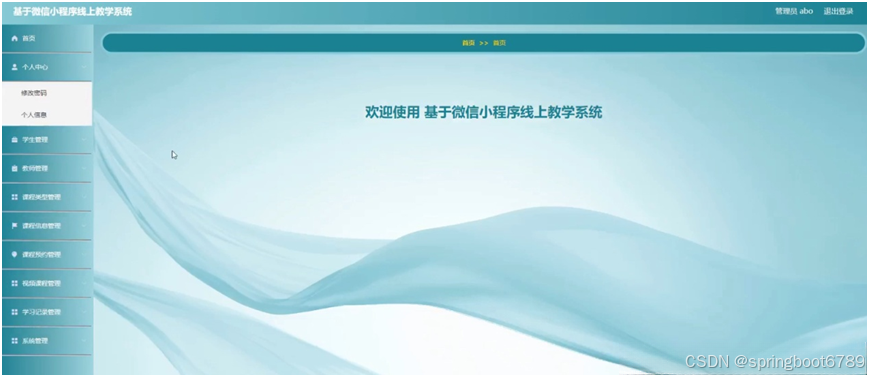 通过前面的功能分析可以将线上教学系统的功能分为学生,教师和管理员三个角色,系统的主要功能包括首页、个人中心、学生管理、教师管理、课程类型管理、课程信息管理、课程预约管理、视频课程管理、学习记录管理、系统管理等内容。任何用户只要进入网站不需登录也可浏览到的信息,后台管理是针对已登录的用户看到满意的线上教学信息而设计的。