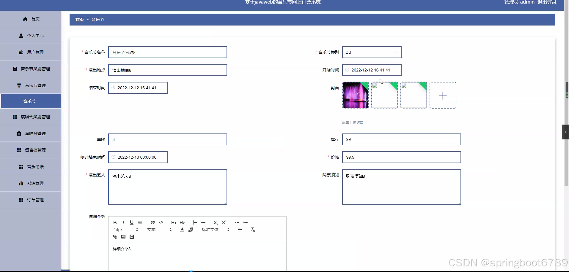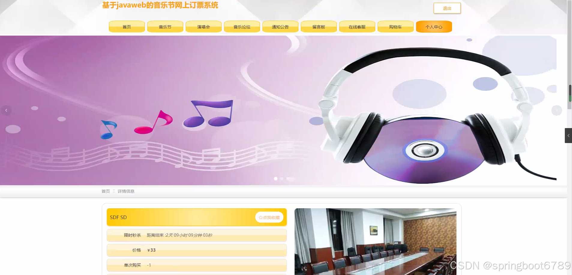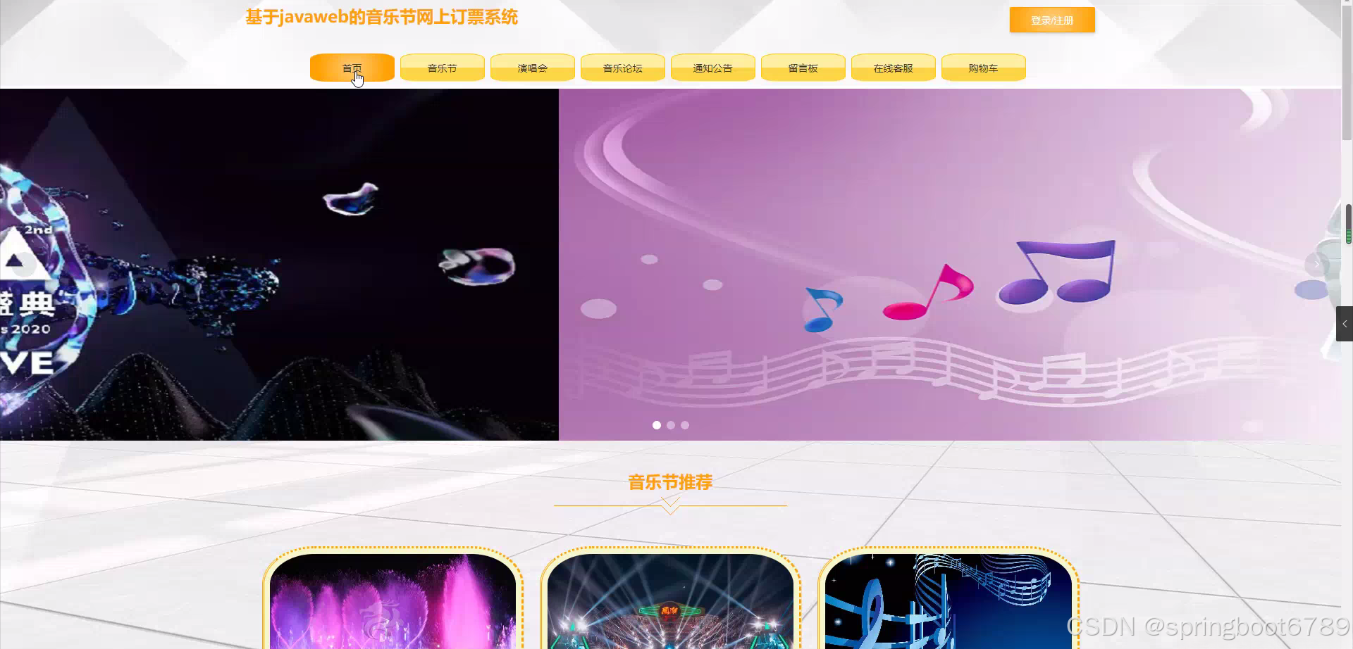 研究意义: 本研究旨在设计和实现一个基于计算机技术的音乐节网上订票系统,通过该系统可以方便地实现用户管理、音乐节类别管理、音乐节管理、演唱会管理、演唱会类别管理等功能。该系统的意义在于提供一个便捷、高效的音乐节门票购买平台,解决传统购票方式存在的问题,提升观众的购票体验。