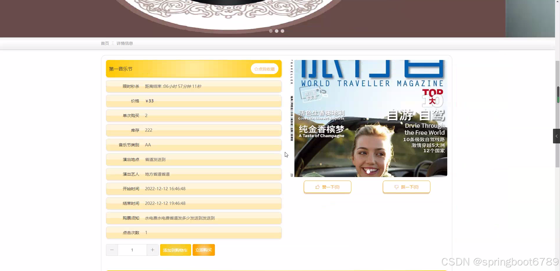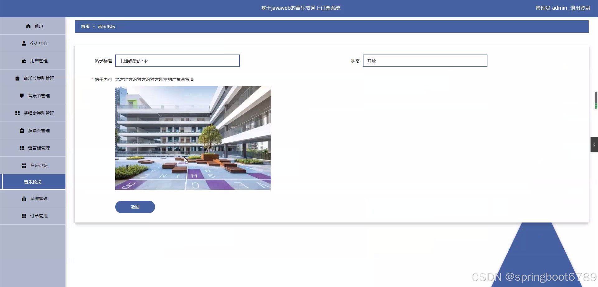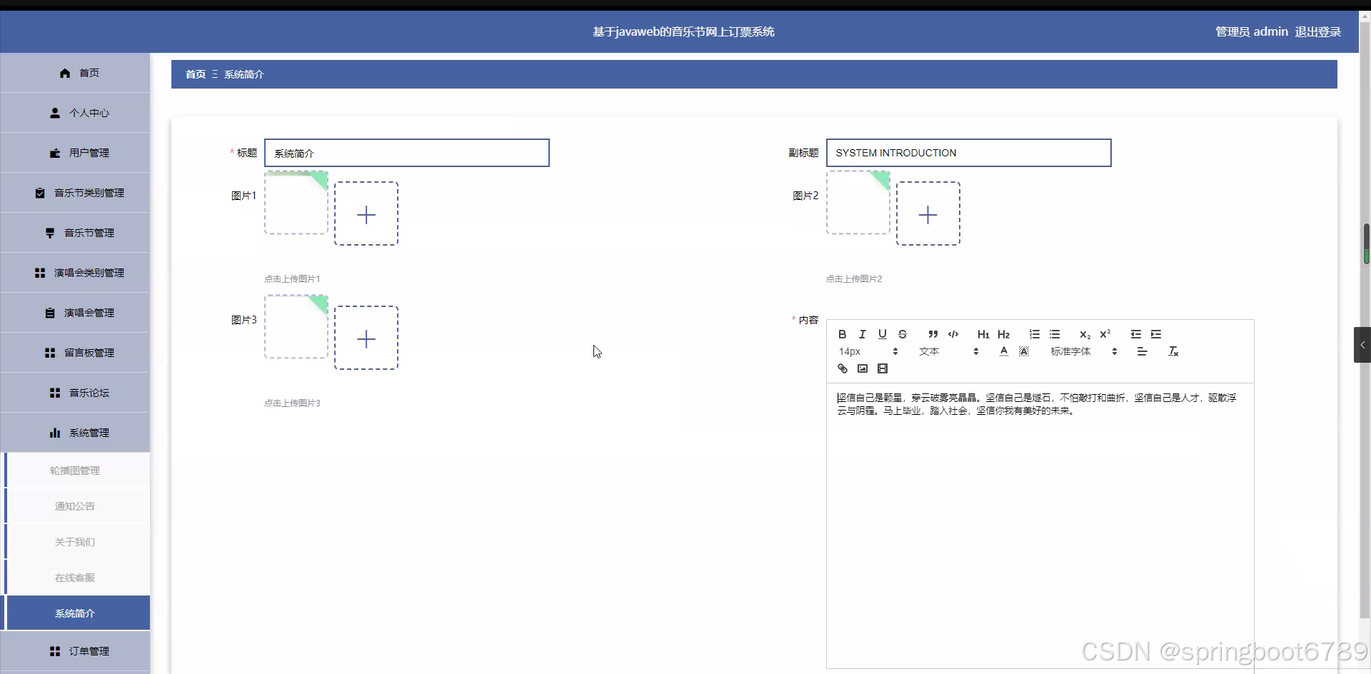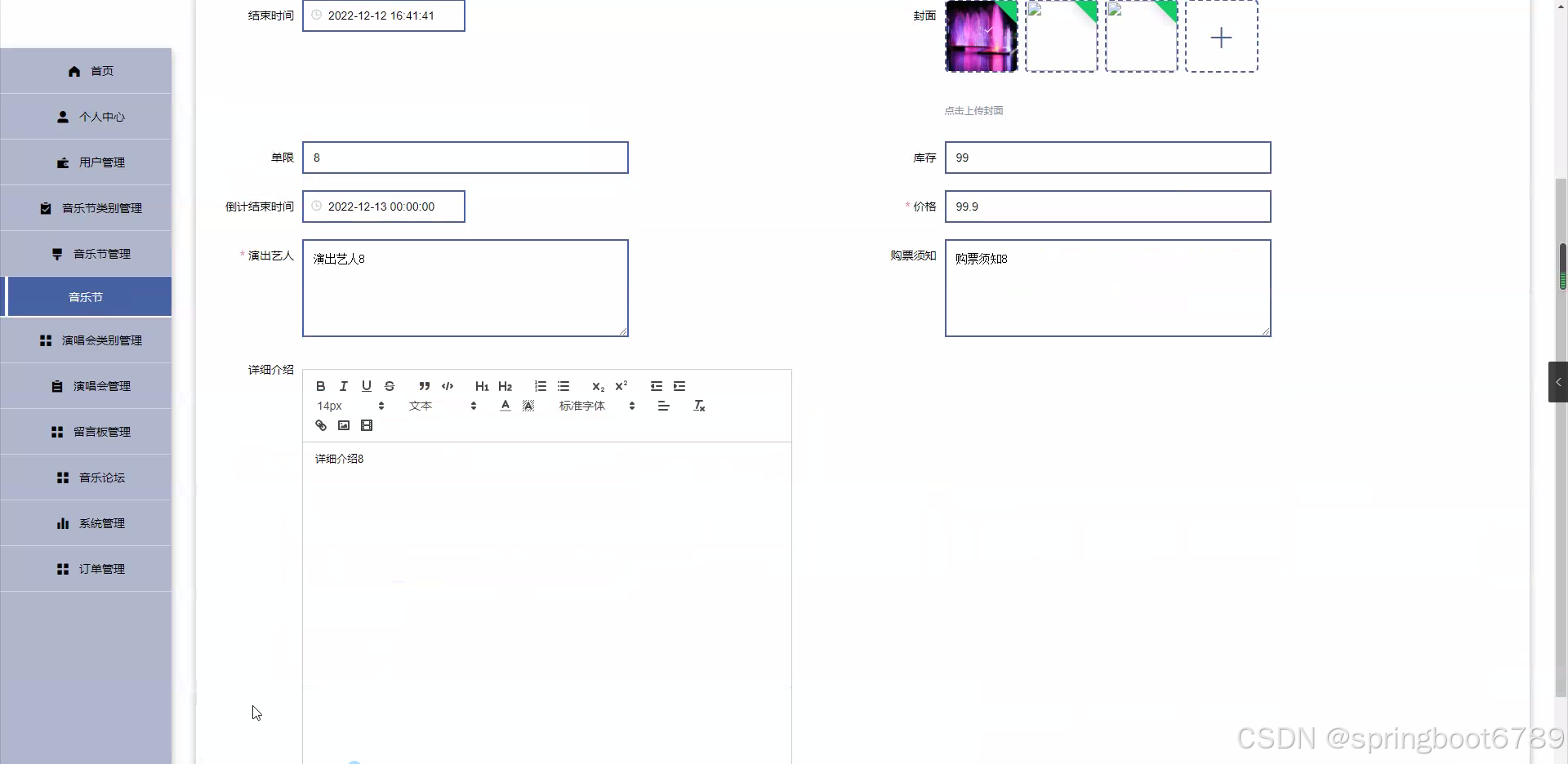 研究意义: 本研究旨在设计和实现一个基于计算机技术的音乐节网上订票系统,通过该系统可以方便地实现用户管理、音乐节类别管理、音乐节管理、演唱会管理、演唱会类别管理等功能。该系统的意义在于提供一个便捷、高效的音乐节门票购买平台,解决传统购票方式存在的问题,提升观众的购票体验。