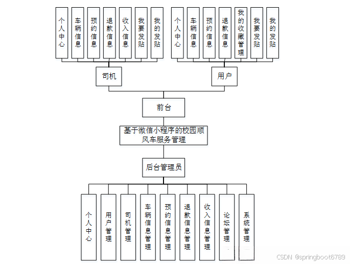 系统整体模块设计:系统分为管理员、用户和司机三大用户角色,系统管理员有最大的权限,整体功能展示如图4-1所示。