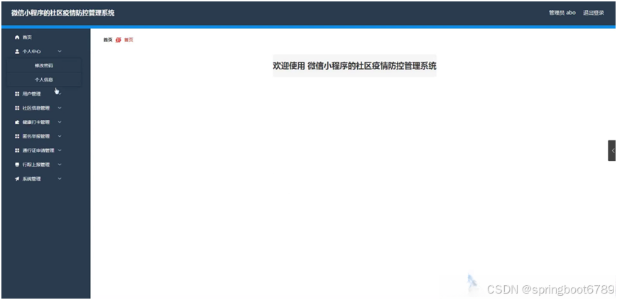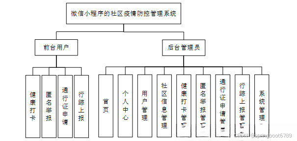 通过前面的功能分析可以将微信小程序的社区疫情防控管理系统的功能分为管理员和用户两个角色,系统的主要功能包括首页,个人中心,用户管理,社区信息管理,健康打卡管理,匿名举报管理,通行证申请管理,行踪上报管理,系统管理等内容。任何用户进入网站都需登录才可以浏览到的信息,后台管理是针对已登录的管理员看到社区疫情防控信息而设计的。