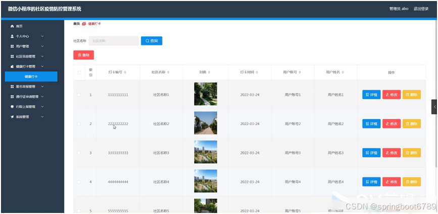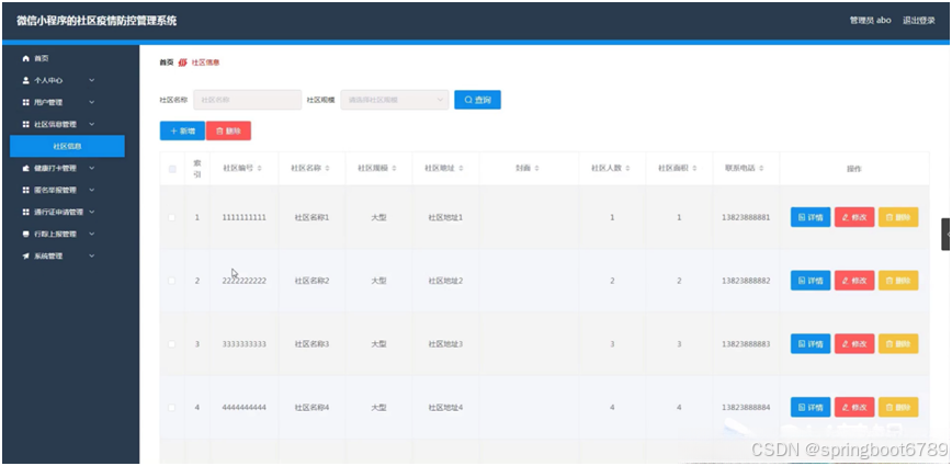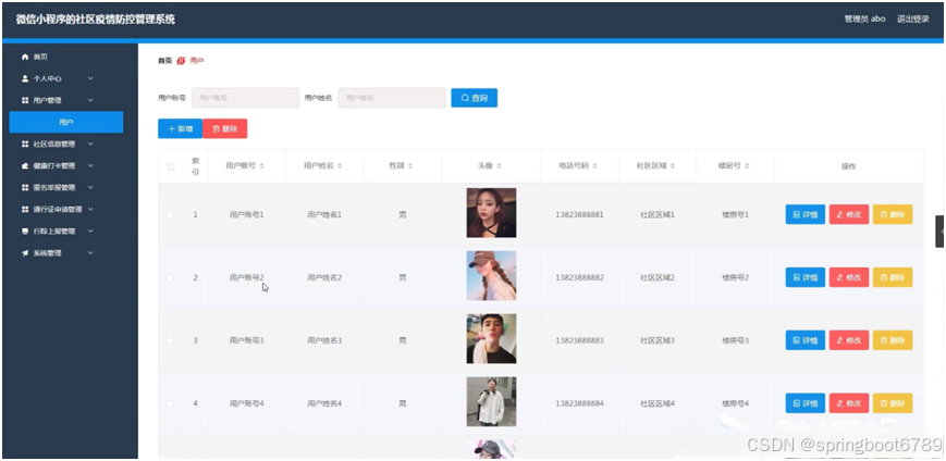 用户信息的添加和管理,社区疫情防控管理系统详细信息添加和管理和文档信息添加和管理以及网站信息管理,这些都是管理员的功能。