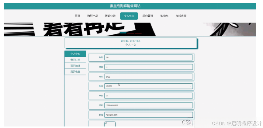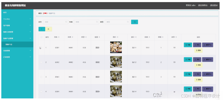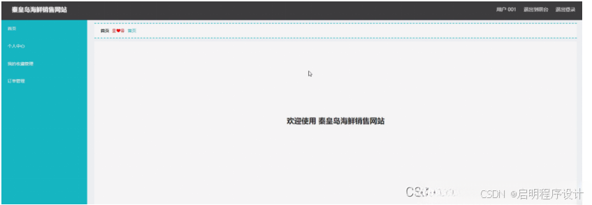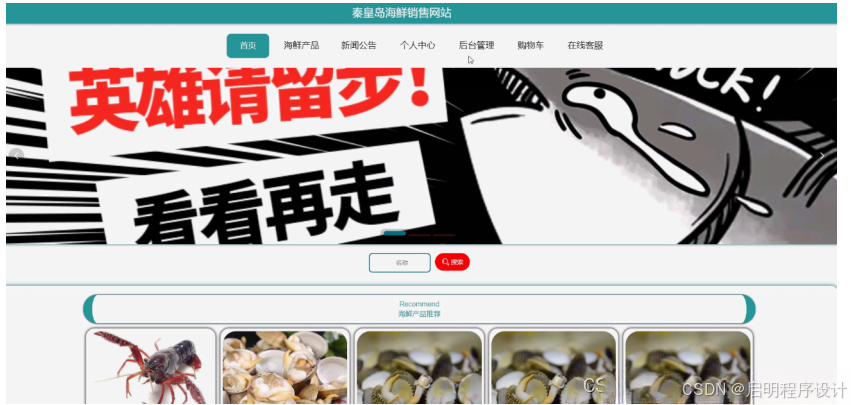 秦皇岛海鲜销售网站,在系统首页可以查看首页、海鲜产品、新闻公告、个人中心、后台管理、购物车、在线客服等内容,如图4-1所示。