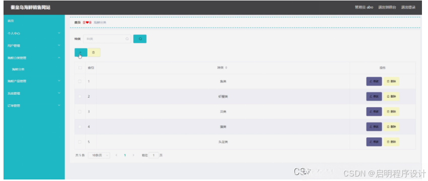 海鲜分类管理,在海鲜分类管理页面中可以查看索引、各类等信息进行修改或删除等详细操作,如图4-8所示。