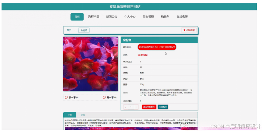 海鲜产品,在海鲜产品页面可以查看名称、限时秒杀、价格、单次购买、库存、种类、类型、重量、图片、简介、点击次数等内容进行详情查看或评论,还可以根据需要进行添加到购物车、立即购买或收藏等操作,如图4-4所示。