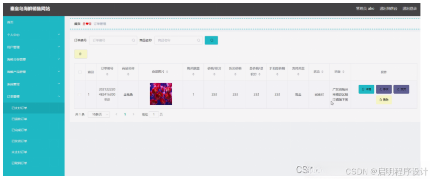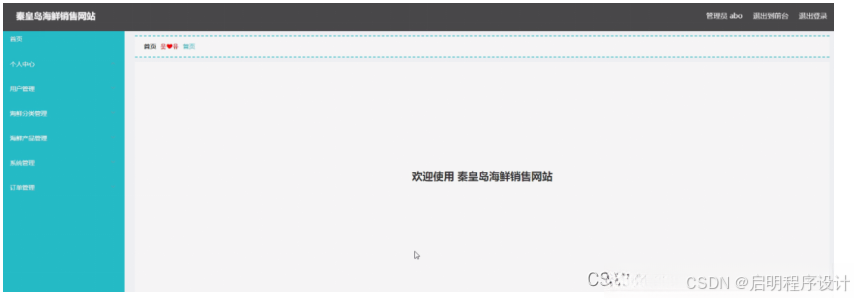 管理员登录进入秦皇岛海鲜销售网站可以查看首页、个人中心、用户管理、海鲜分类管理、海鲜新产品管理、系统管理、订单管理等信息,如图4-6所示。