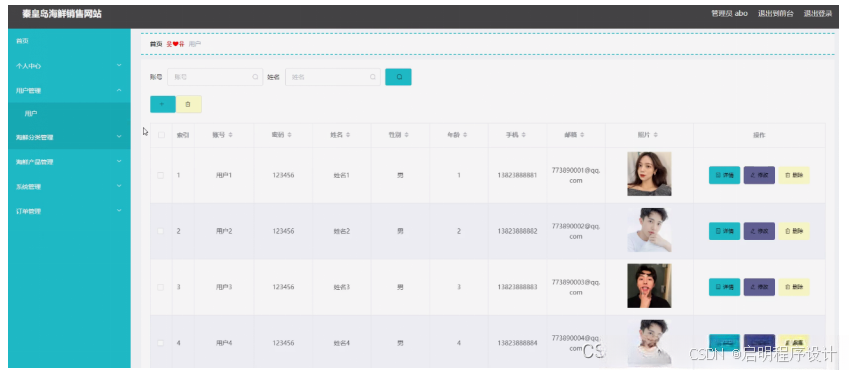 用户管理,在用户管理页面中可以查看索引、账号、密码、姓名、性别、年龄、手机、邮箱、照片等信息进行修改或删除等操作,如图4-7所示。