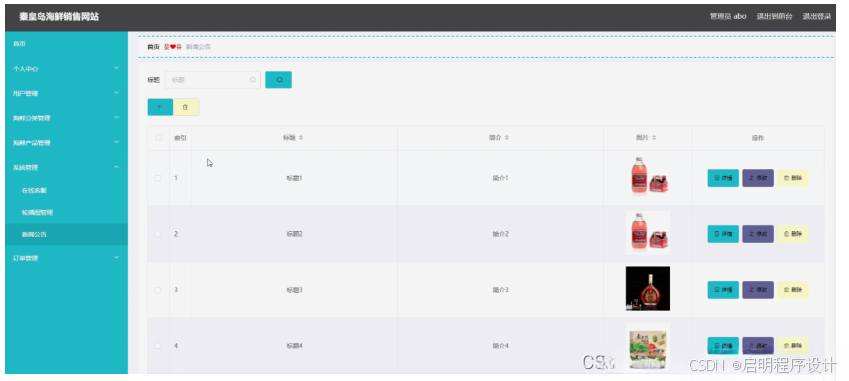 系统管理,在新闻公告页面中可以查看索引、标题、简介、图片等内容进行详情、修改或删除等详细操作,并且根据需要对在线客服、轮播图管理进行相应操作,如图4-10所示。