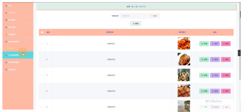 美食种类管理,在美食种类管理页面可以查看索引、种类名称、相关图片等内容,并可根据需要进行修改或删除操作,如图5-15所示。