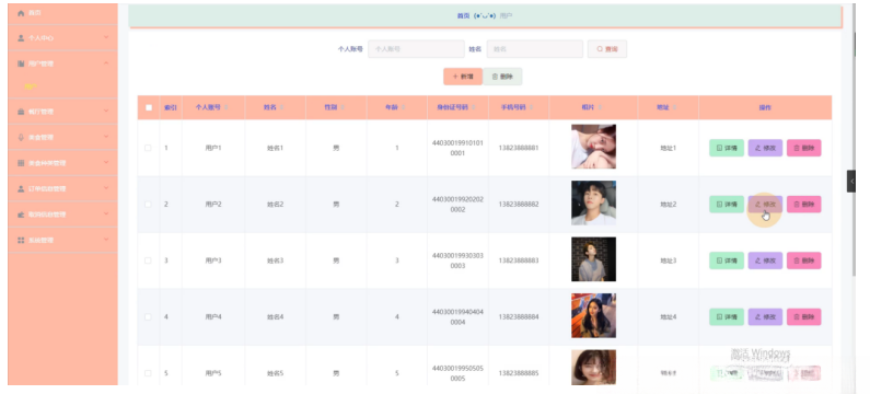 用户管理,在用户管理页面可以查看索引、个人账号、姓名、性别、年龄、身份证号码、手机号码、相片、地址等内容,并可根据需要进行修改或删除操作,如图5-12所示。