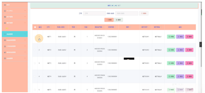 餐厅管理,在餐厅管理页面可以查看索引、工号、负责人姓名、性别、年龄、身份证号码、手机号码、相片、餐厅名字、餐厅地址等内容,并可根据需要进行修改或删除操作,如图5-13所示。
