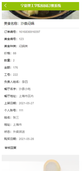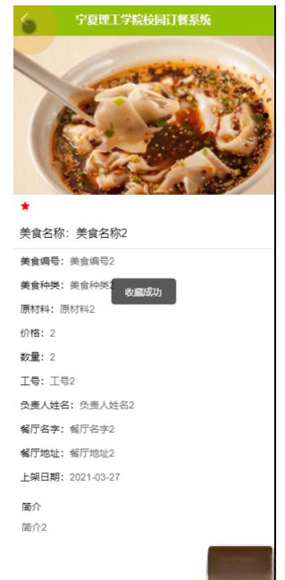 美食,在美食页面可以查看美食编号、美食名称、美食种类、简介、原材料、价格、数量、美食图片、工号、负责人姓名、餐厅名字、餐厅地址、上架日期等详细美食信息,进行预订,如图5-4所示。