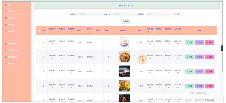 美食管理,在美食管理页面可以查看索引、美食编号、美食名称、美食种类、简介、原材料、价格、数量、美食图片、工号、负责人姓名、餐厅名字、餐厅地址、上架日期等内容,并可根据需要进行修改或删除操作,如图5-14所示。