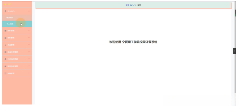 在管理员功能页面可以查看首页、个人中心、用户管理、餐厅管理、美食管理、美食种类管理、订单信息管理、取消订单管理、系统管理等内容进行相对应操作,如图5-11所示。