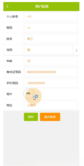 用户信息,在用户信息页面通过填写个人账号、密码、姓名、性别、年龄、身份证号码、手机号码、相片、地址等信息进行保存,如图5-8所示。