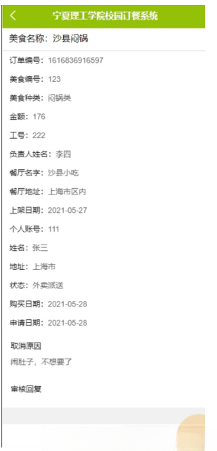 取消信息,在取消信息页面可以可以查看订单编号、美食编号、美食名称、美食种类、金额、工号、负责人姓名、餐厅名称、餐厅地址、上架日期、个人账号、姓名、地址、状态、购买日期、申请日期、取消原因、审核回复等详细信息,进行支付或审核操作,如图5-6所示。