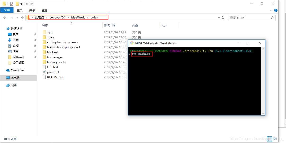找到刚下载的项目位置,进入到如图的目录文件夹内,按住ctrl+shift+鼠标右键 选择命令窗口,运行mvn package (maven环境变量要配置,否则找不到命令)这时maven会生成4.2.0版本的lcn