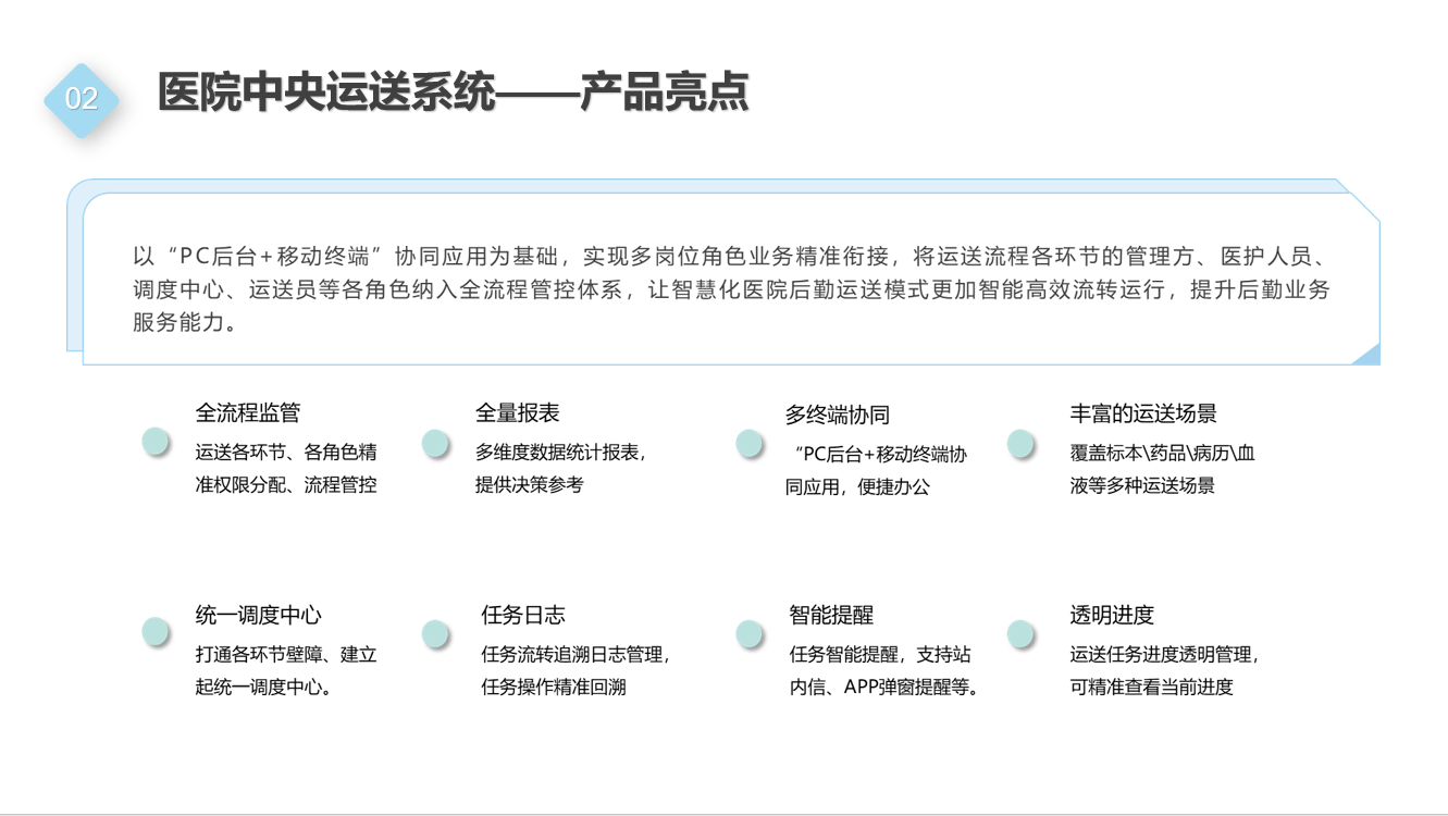 多场景适配:涵盖病患转运、药品配送、标本送检等20+类运送场景,并支持自定义流程配置,满足不同医院的个性化需求。