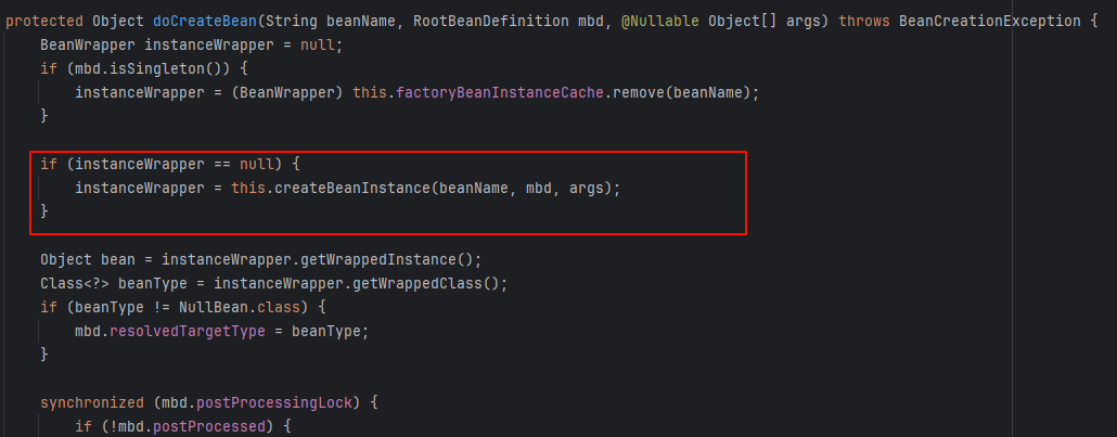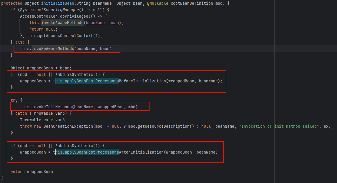 bean 生命周期中的调用 Aware接口方法,bean init-method 方法 和 BeanPostProcessor 前置和后置方法都在以下方法处理的