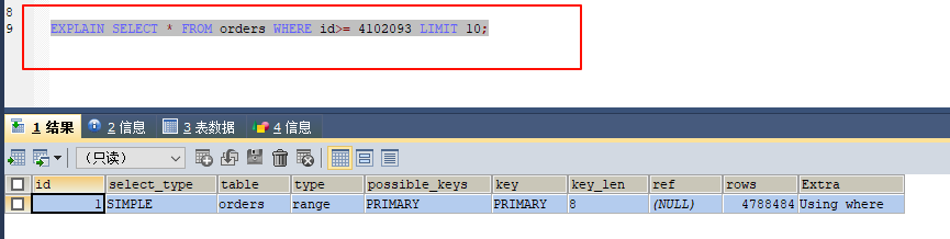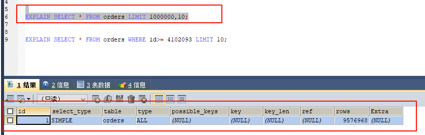 分页加上id范围条件 sql 类似 SELECT * FROM orders WHERE id>= 4102093 LIMIT 1000;