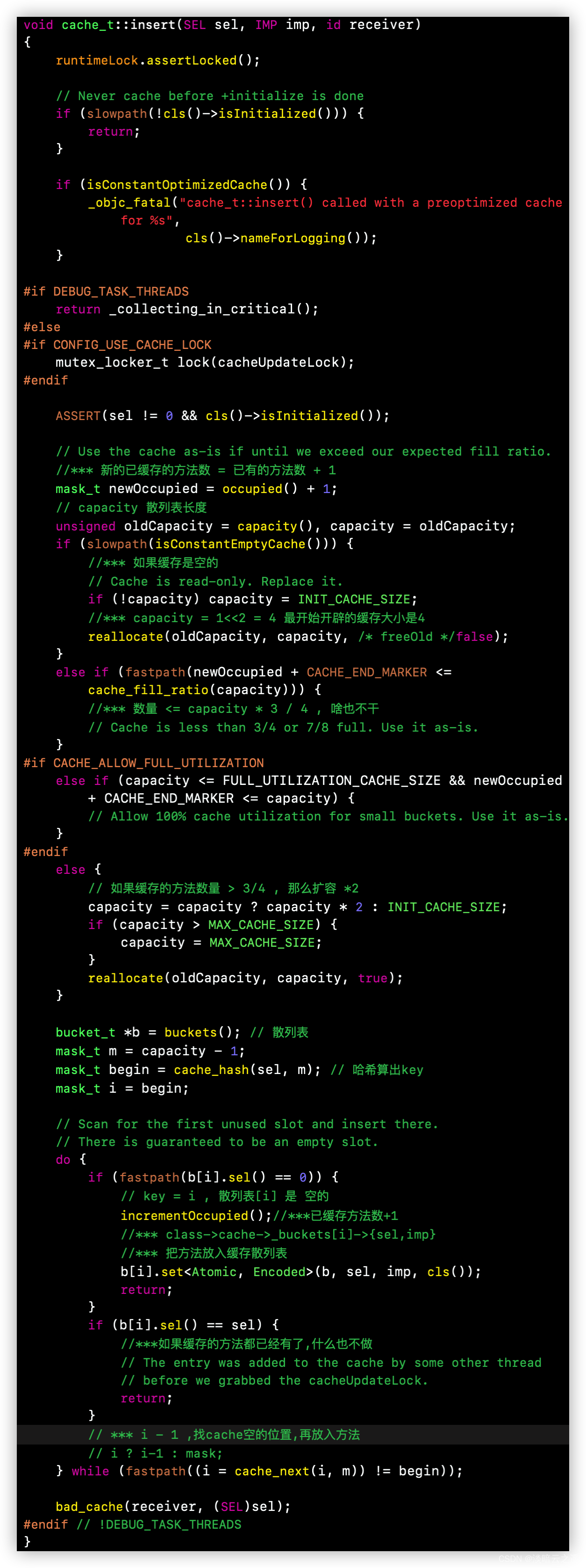 - setBucketsAndMask : 设置新的bucket和mask , 会把已有的缓存中的方法数设为0 , _occupied = 0;