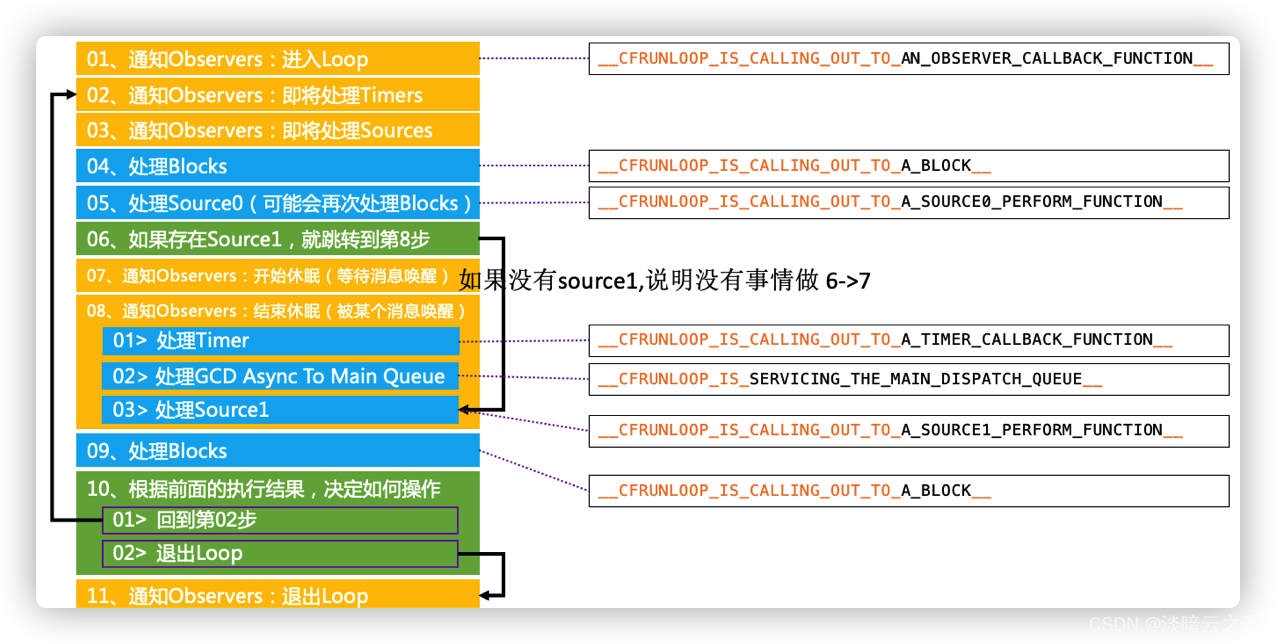 - RunLoop保存在一个全局的Dictionary里,线程为key, RunLoop为value