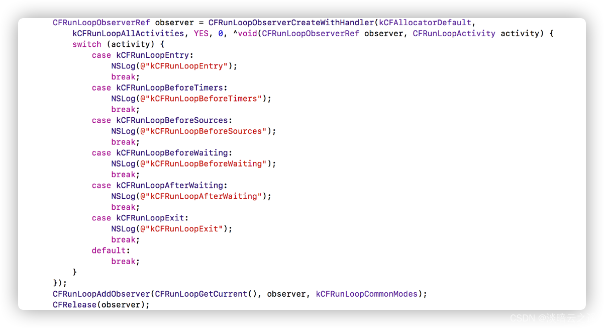 CFRunLoopAddObserver(CFRunLoopGetMain(), observer, kCFRunLoopDefaultMode);