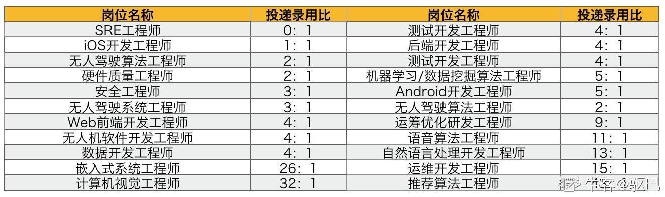 如图是网传美团岗位投录比,大概可以反映一些现在求职情况。结合我个人的见闻,从竞争难度上说,前端,测试,竞争较小,后端与大数据工程师有一些压力,算法则已经进入众神黄昏,求职彻底白热化。从薪酬上看,算法与开发已经基本持平。但是也不是完全劝退算法岗,只是一定要慎重选择。决定自己想投递的岗位后,下一步:准备简历。