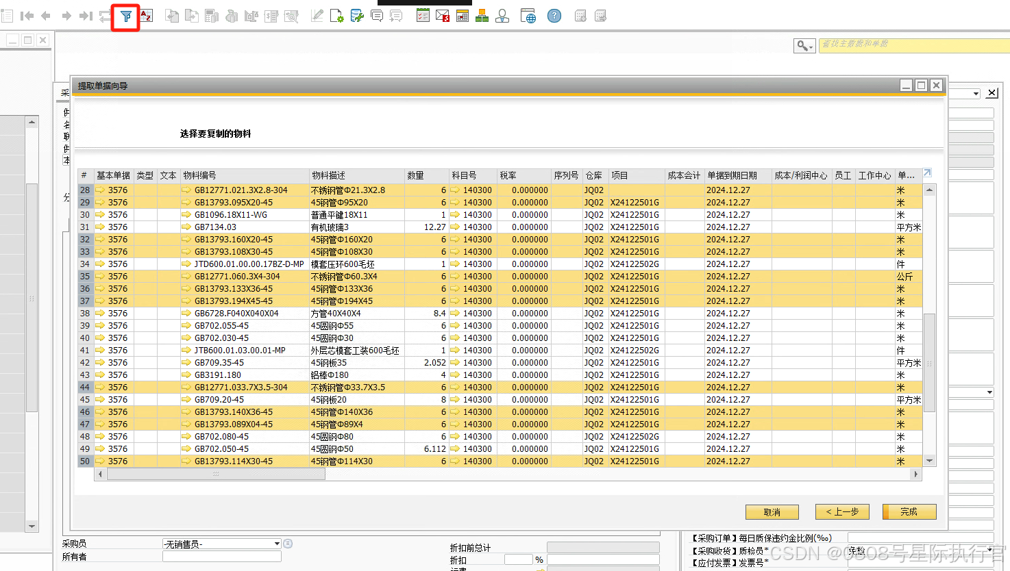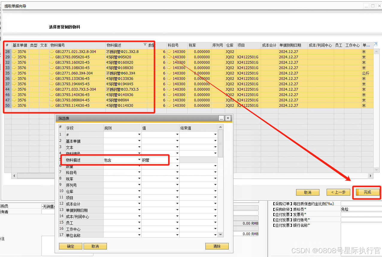 下图是错误展示,如果筛选选中后直接点完成,会发现带到单据上的内容不对