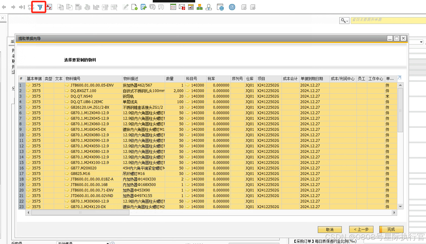 如下图所示:在筛选出所有物料编号是A00003的物料并选中后,再点击一次“筛选漏斗” 取消筛选,选中的行会保留,此时再点完成,就不会错乱了