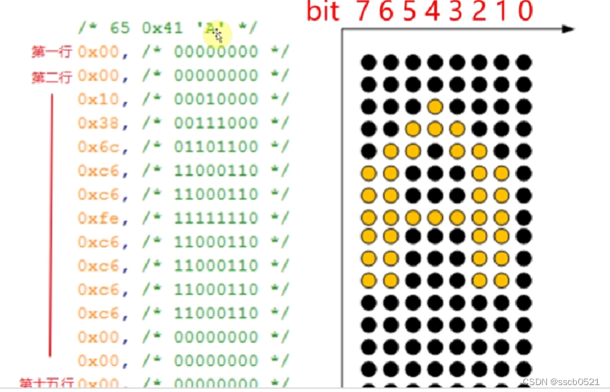 例如fontdata_8x16,表示横坐标8个像素,纵坐标16个像素。对于1个字符,用16个字节表示,每个字节对应1行的8个像素点,为1的位表示点亮,0表示熄灭。