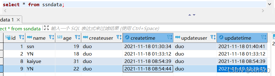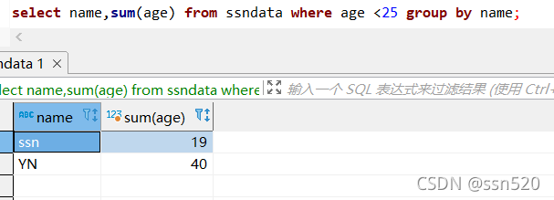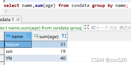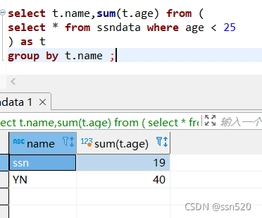 (select name,sum(age) as sumage from ssndata group by name) as t