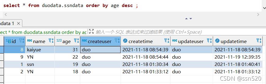 默认按照升序对记录进行排序。如果需要按照降序对记录进行排序,您可以使用 desc 关键字