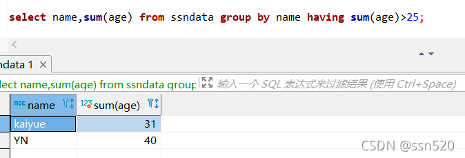 select name,sum(age) from ssndata group by name having sum(age)>25;