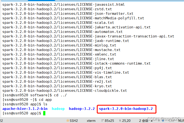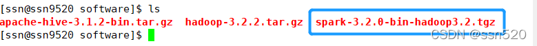 [ssn@ssn9520 software]$ tar -zxvf spark-3.2.0-bin-hadoop3.2.tgz -C /home/ssn/app/