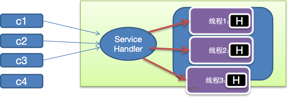 1. 基于I/O复用模型:多个连接共用一个阻塞对象ServiceHandler,应用程序只需要在一个阻塞对象等待,无需阻塞等待所有连接。当某个连接有新的数据可以处理时,操作系统通知应用程序,线程从阻塞状态返回,开始进行业务处理。