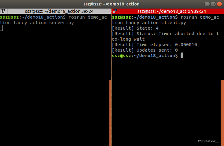 表现出的行为与预期吻合:服务器首先执行最开始的目标,并定时进行反馈,直到客户端发出了终止请求。发出终止请求后,客户端很快就收到了服务端发来的结果,表明上一次执行被中断(PREEMPTED = 2)