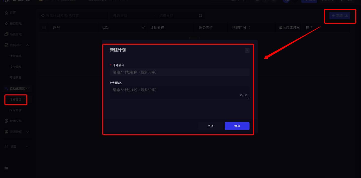 在左侧导航栏选择:自动化测试-计划管理-新建计划,创建自动化测试计划。