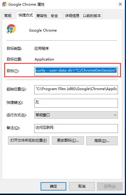 可能会遇到跨域的问题,可以在谷歌浏览器的快捷方式中目标框内键入【"C:\Program Files (x86)\Google\Chrome\Application\chrome.exe" --args --disable-web-security --user-data-dir="C:/ChromeDevSession"】