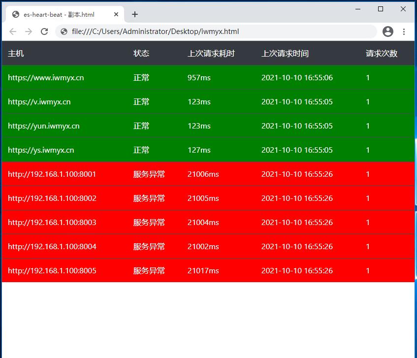 该博客介绍了一个用于监控多个服务器运行状态的HTML页面,包括主机名、状态、请求耗时、请求时间和请求次数等信息。通过定时发送请求检查服务是否可用,并根据响应时间展示不同的背景颜色。此外,还提供了在谷歌浏览器中禁用Web安全以解决跨域问题的方法。