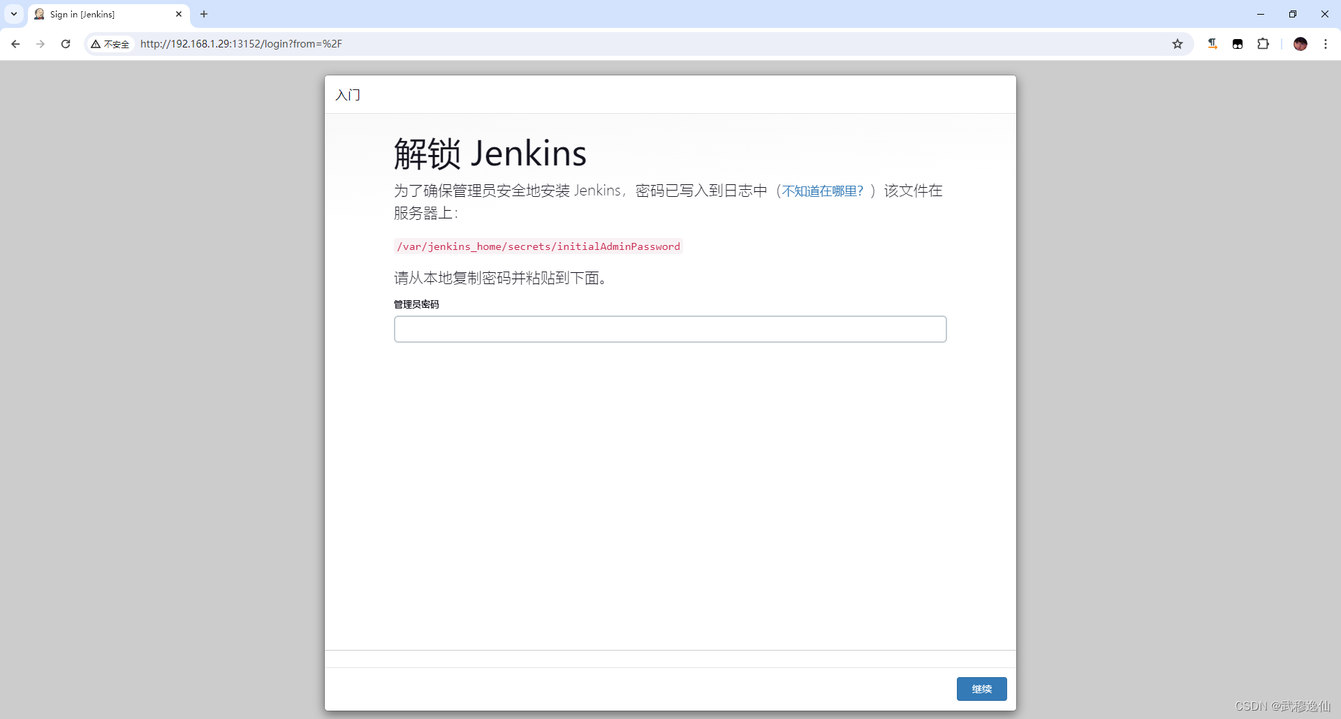 查看管理员密码,并输入【cat /www/jenkins/secrets/initialAdminPassword】,点【继续】