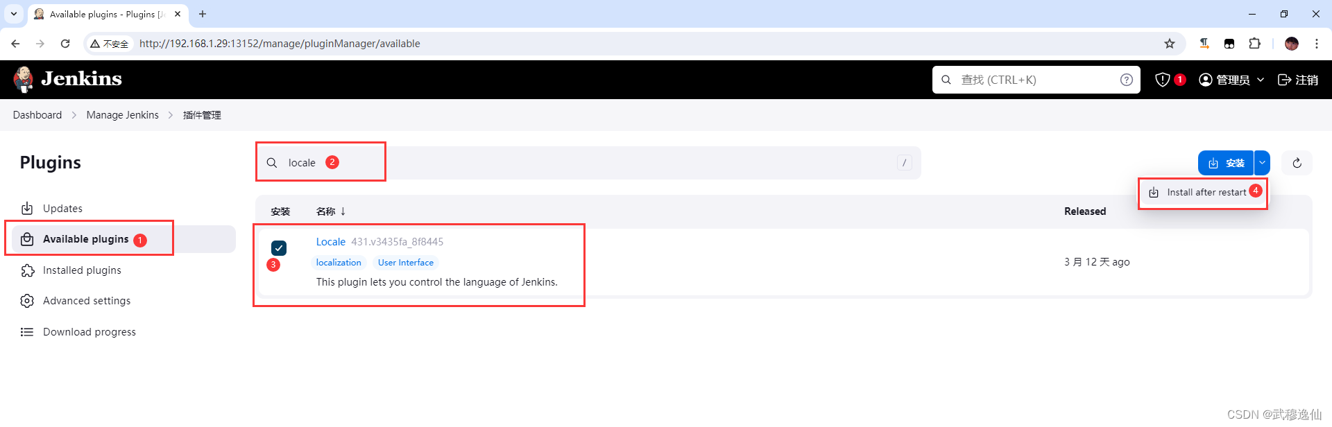 点击 Avaliable Plugins >> 在搜索栏输入 locale >> 勾选插件 >> 点击Install after retstart。